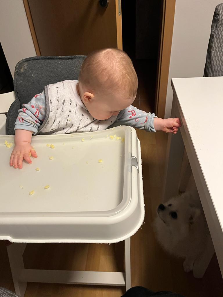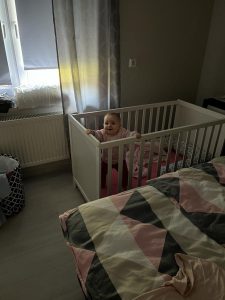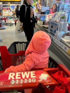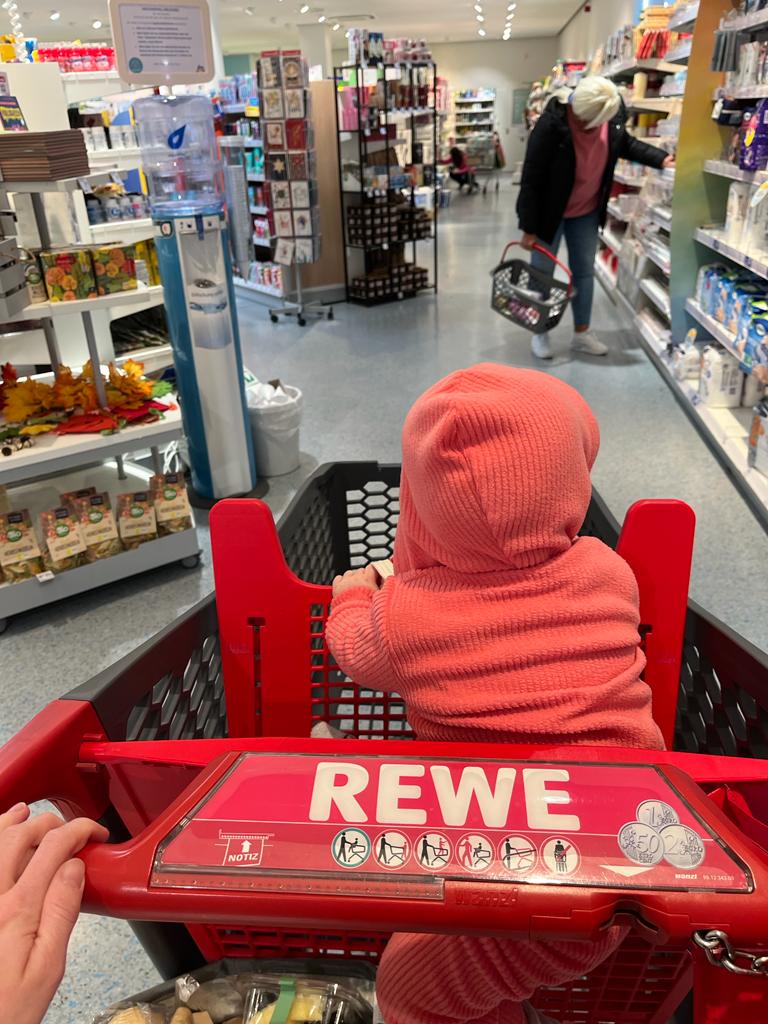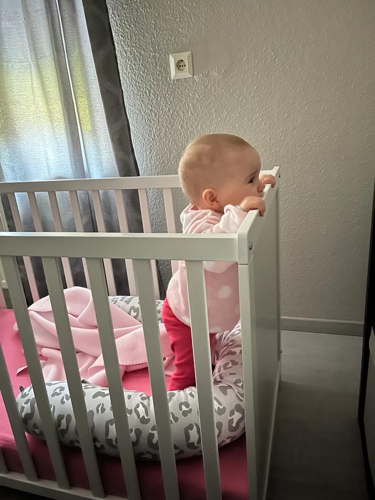 04.10.2022 Aryana - Von Anfang an In meinem Bett kann ich nun auch stehen. Beim Einkaufen will ich immer umgedreht sitzen. Dann kann ich die anderen Leute beobachten und ihnen winken. Hier spiele ich ganz konzentriert alleine mit Opas Liederbuch.