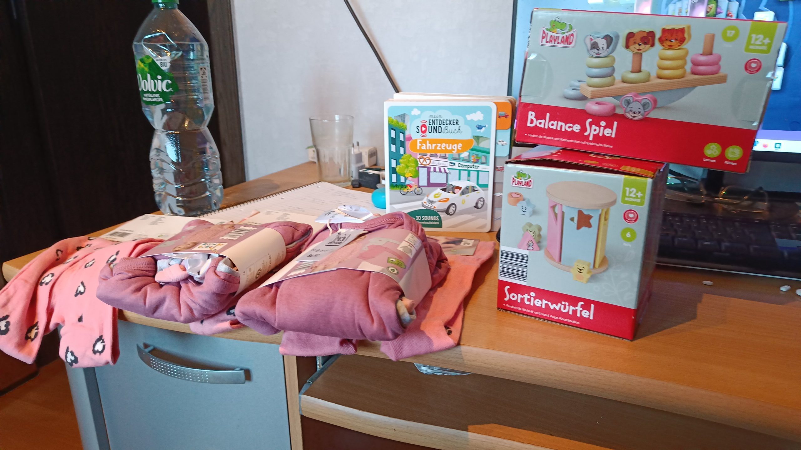 Heute gab es jede Menge Fotos. Ich musste ja alle meine Spielzeuge mal zeigen. Oma hat für mich eingekauft. Wieder neue Klamotten, weil ich so schnell wachse und auch ein paar Spielzeuge. Hoffentlich bekomme ich die bald.