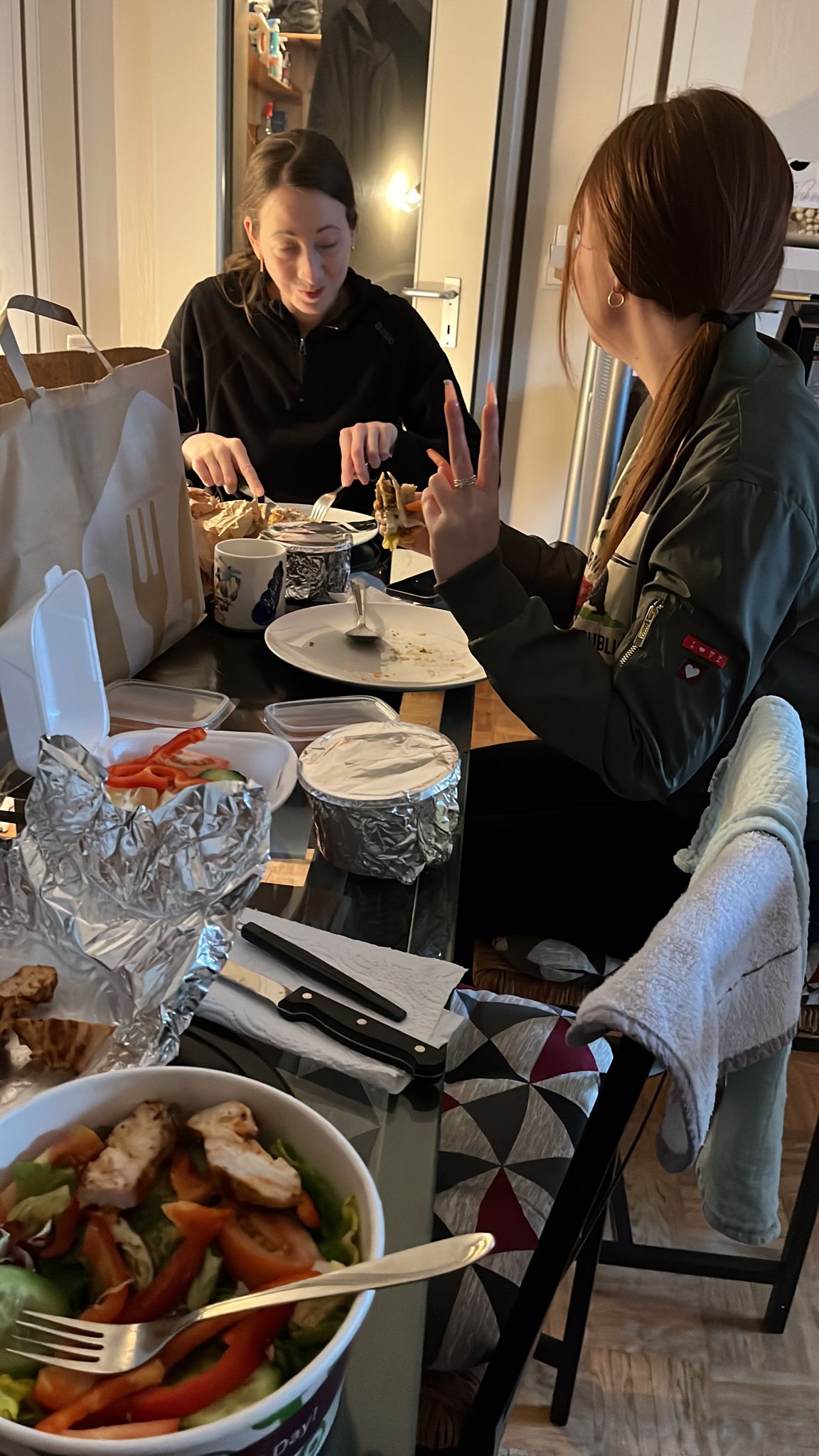 Heute waren Mama’s Freundinnen wieder da (Karla und Gianna). Zum Glück – denn bei unserem Nachbarn lief Wasser aus und hat uns die Wohnung versaut. Die beiden haben geholfen die Sauerei wieder zu beseitigen. Aber die Wände sind nass und wir bekommen einen Lüftungsschlauch in die Küche.