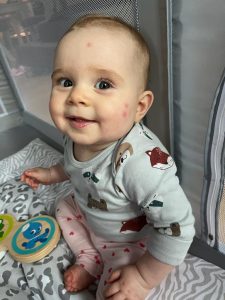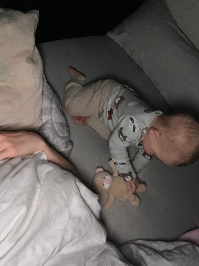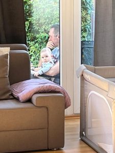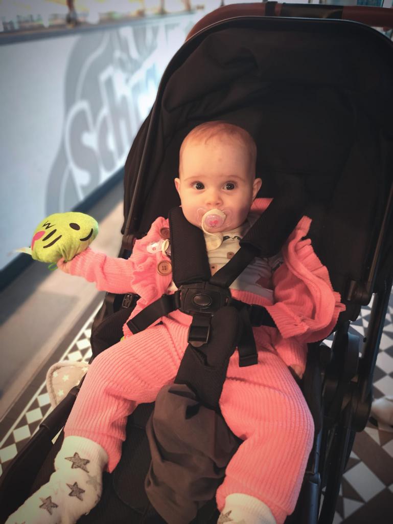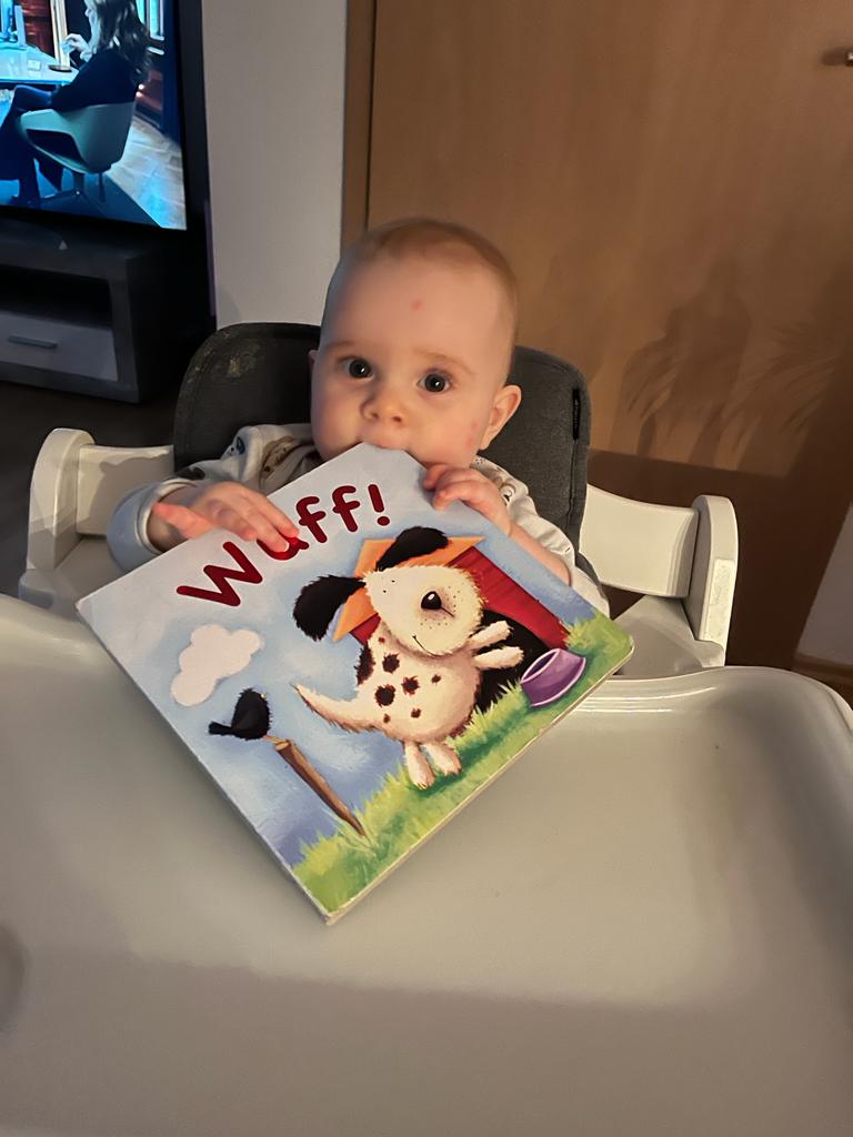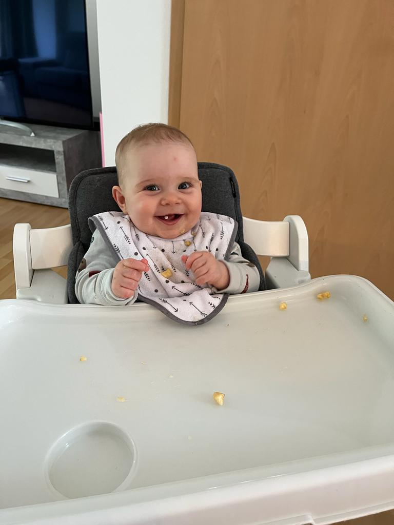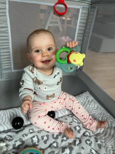 Ein ganz tolles Spielzeug ist diese Trommel, die auch Melodien abspielt. Das ist in Zukunft mein Lieblingsspielzeug. Zur Musik tanze ich im Sitzen.