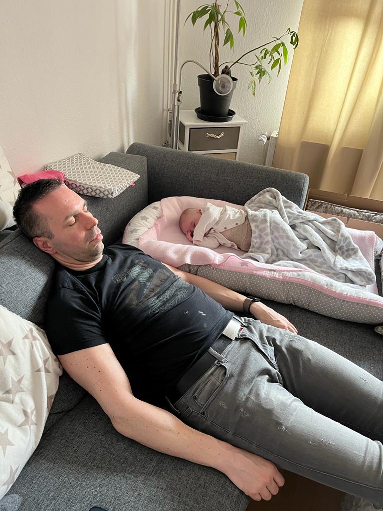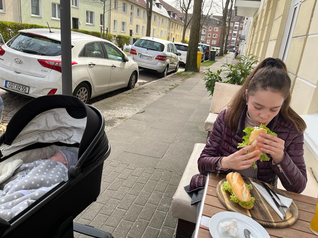 Hurra!!! Papa ist wieder da. Wir haben zusammen ein Nickerchen gemacht. Mit Sibel war ich im Cafe May. Meine Schwester hatte Hunger.