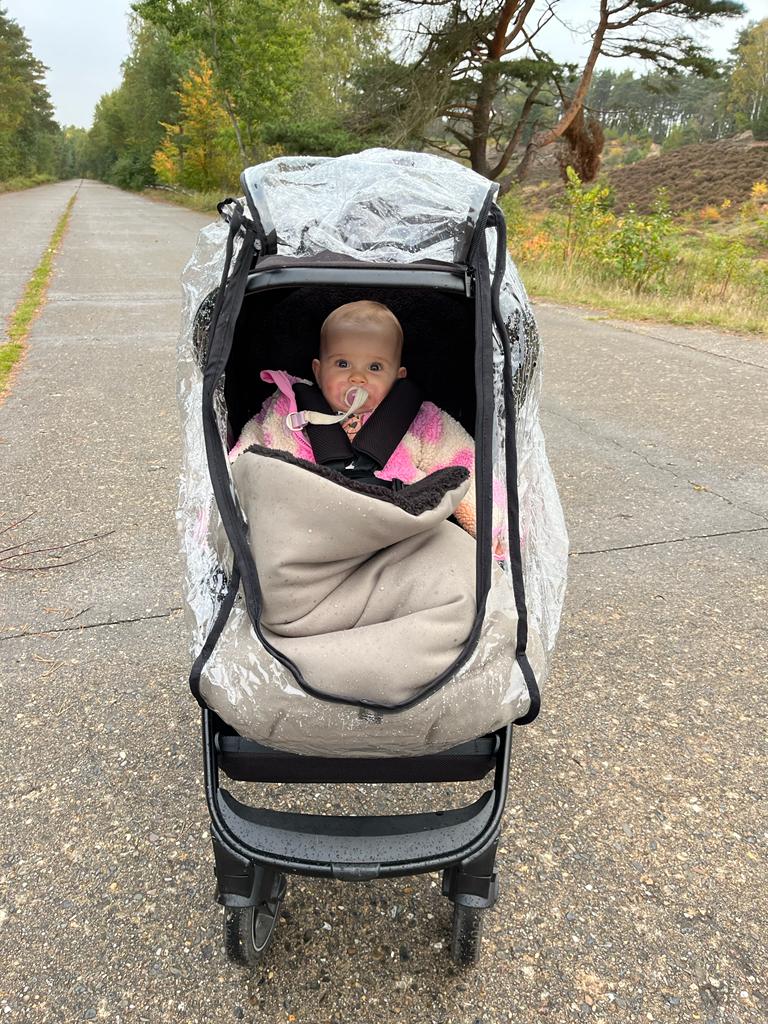 15.10.2022 Aryana - Von Anfang an Mama hat einen Schutz für meinen Kinderwagen, damit ich nicht nass werde, wenn wir im Regen unterwegs sind. Regenmobil nennt sie das.