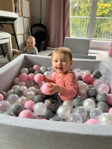 19.10.2022 Aryana - Von Anfang an Malou war zu Besuch und wir haben in den Bällen gespielt. Wenn ich allein spiele höre ich gern Musik. Mama war heute ganz albern und hat „Loki gespielt“ als wir spazieren waren. Mein Essen schmeckt gut!