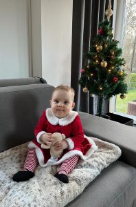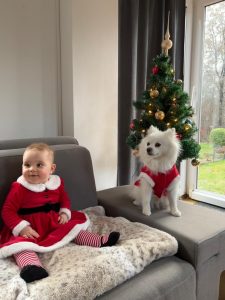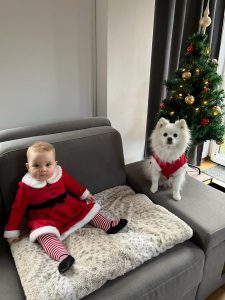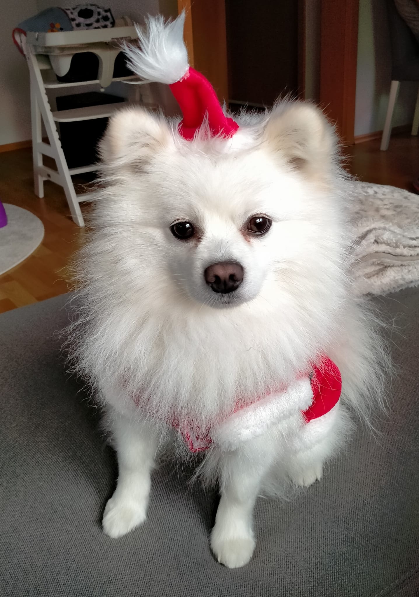 Heute war Heiligabend. Da bekam selbst Loki eine Weihnachtsmütze. Ich hatte wieder ein Kleidchen an. Diesmal ganz in rot – so wie der Weihnachtsmann.