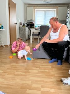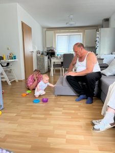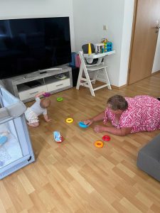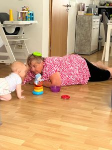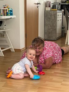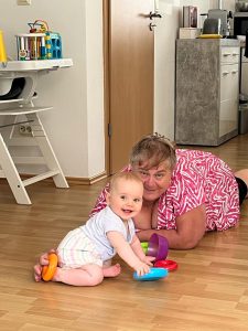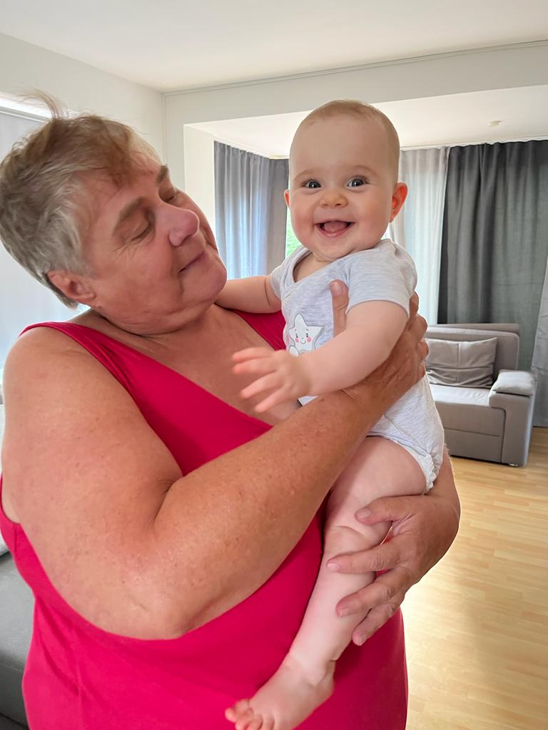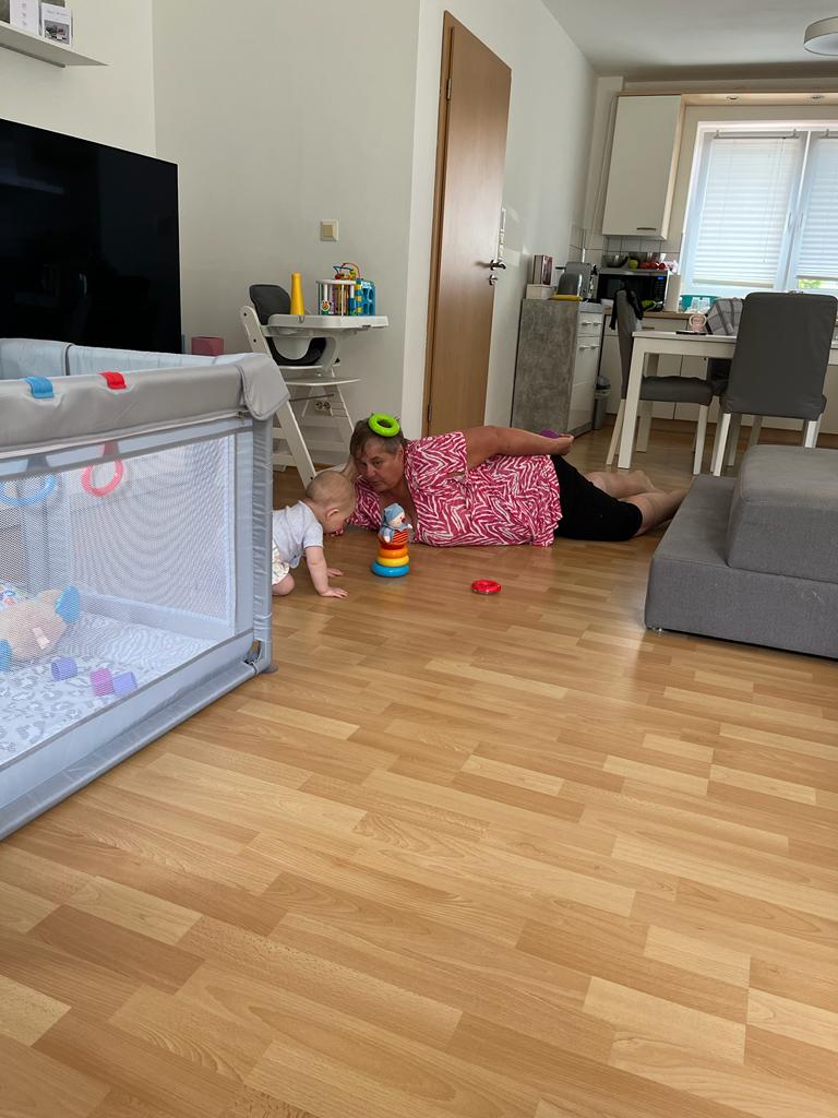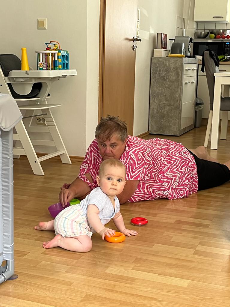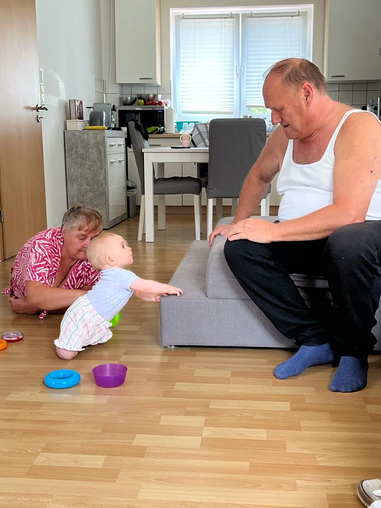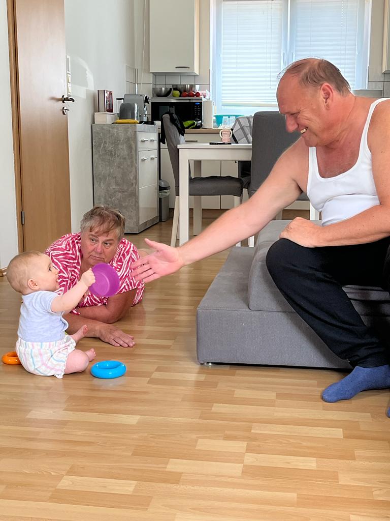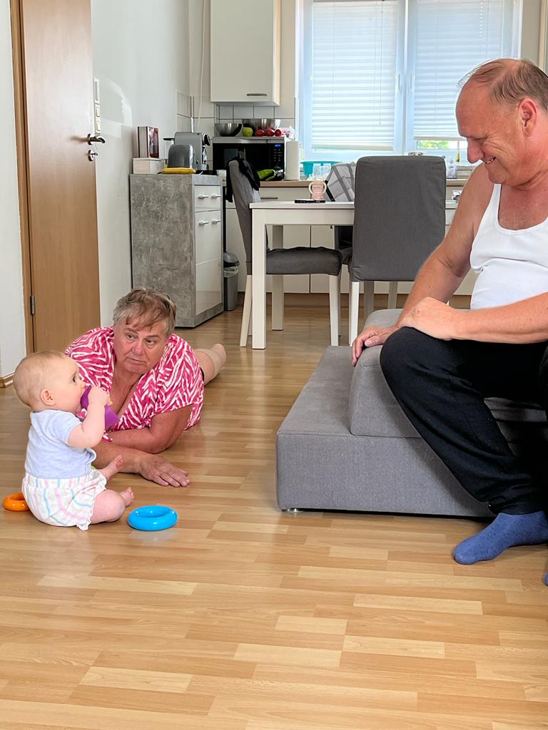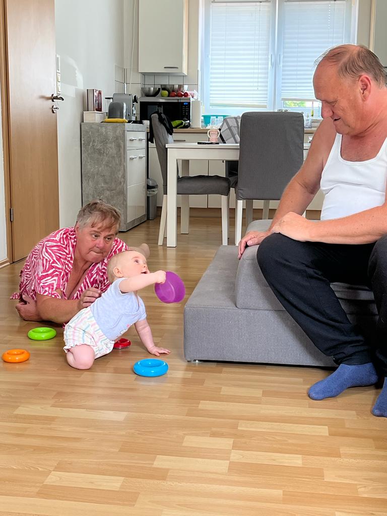 Heute waren Oma, Opa und Ulrike wieder da. Die haben natürlich wieder jede Menge Fotos gemacht und fast den ganzen Tag mit mir gespielt. Ich hab denen auch gezeigt, das ich schon fast aufstehen kann. Zwischendurch waren Mama und Ulrike noch schwimmen. Opa und Oma waren aber ja bei mir.