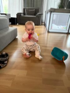 28.08.2022 Aryana - Von Anfang an Sind das nicht schöne Fotos heute. Aber es gibt auch ein Video. Ich sitze in meinem Hochstuhl (ganz alleine) und habe wieder ein neues Spielzeug.