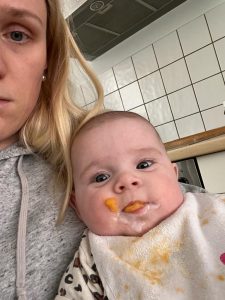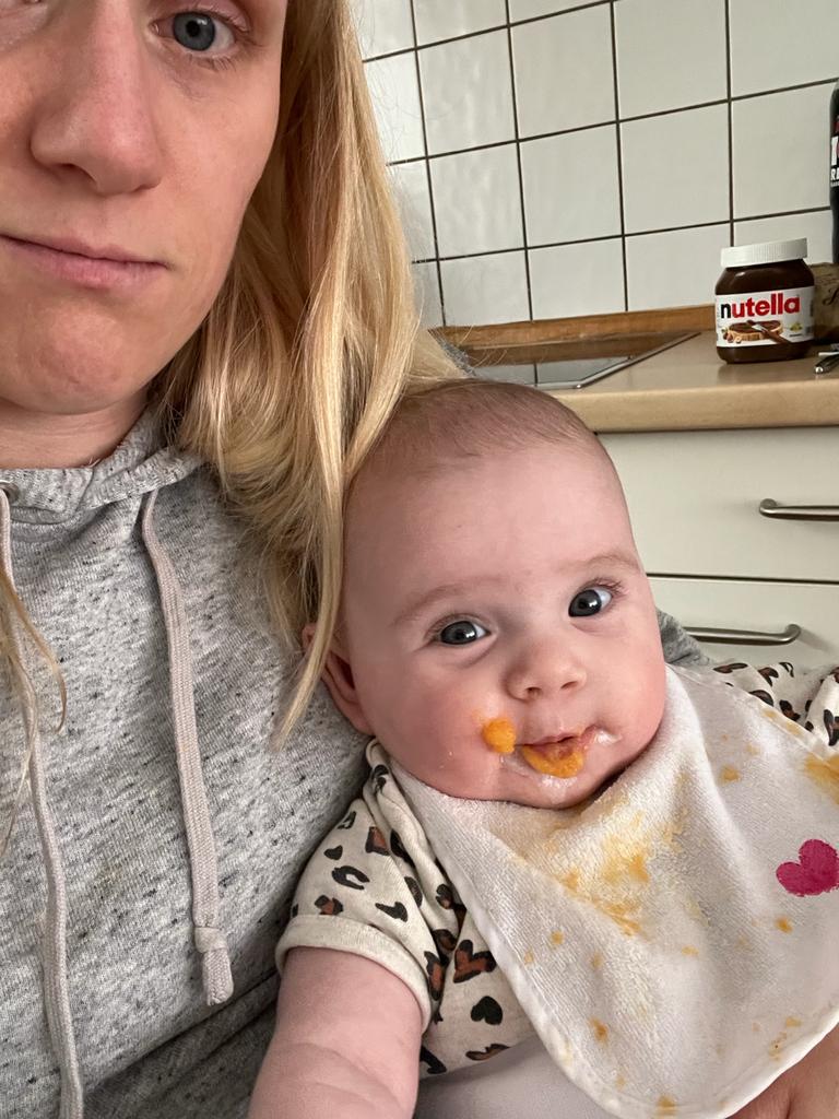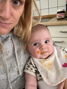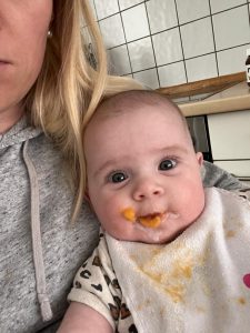 29.05.2022 Aryana - Von Anfang an Ich habe wieder Brei bekommen. Danach sah es so aus, als ob ich alles nur auf dem Lätzchen hätte. Dabei habe ich toll gegessen.