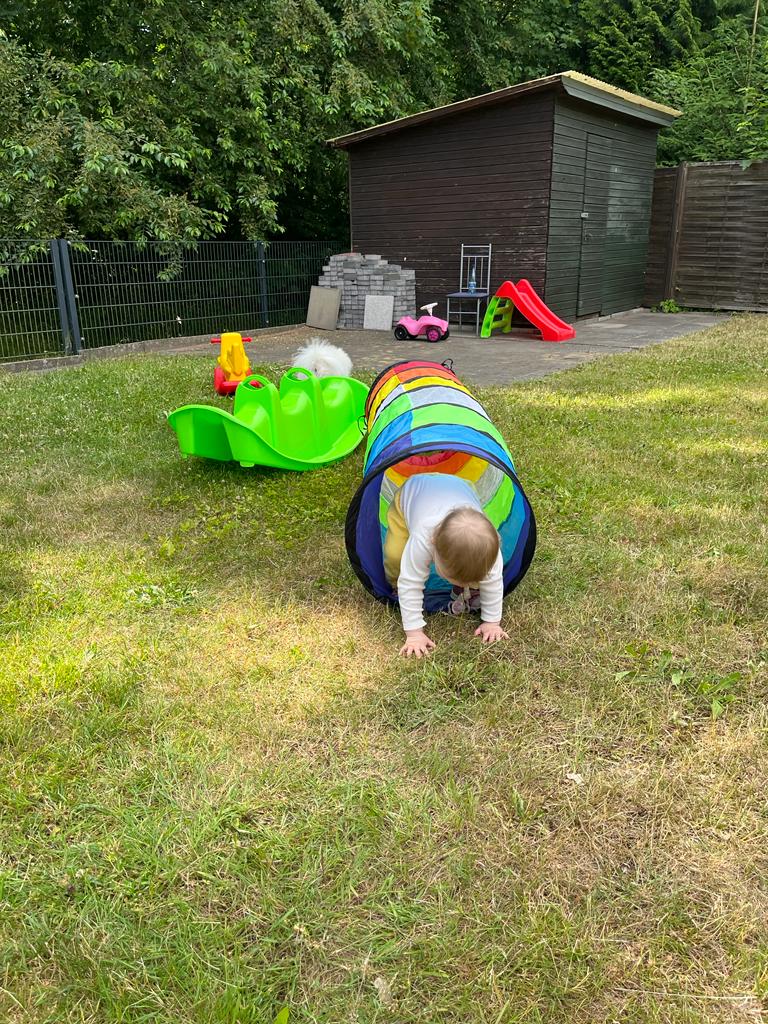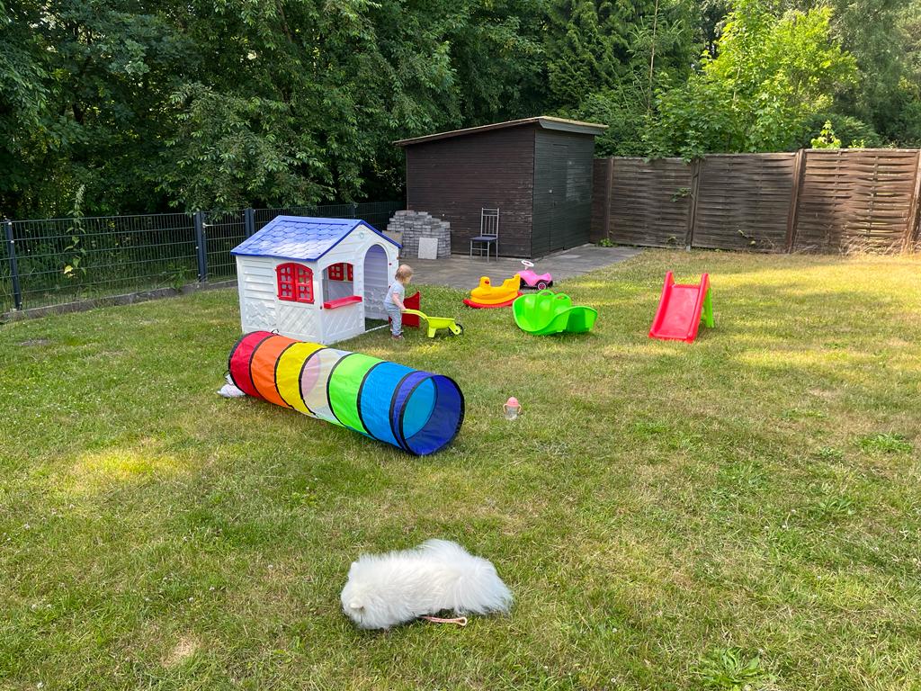 Dafür spiele ich jetzt oft mit Loki. Das macht besonders viel Spaß. Und ich habe ein Häuschen und viele andere Gartenspielzeuge bekommen. Da kann ich mich im Garten toll austoben.
